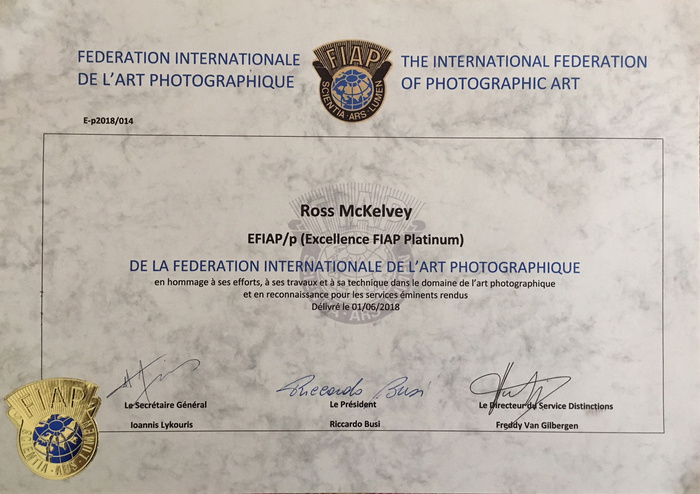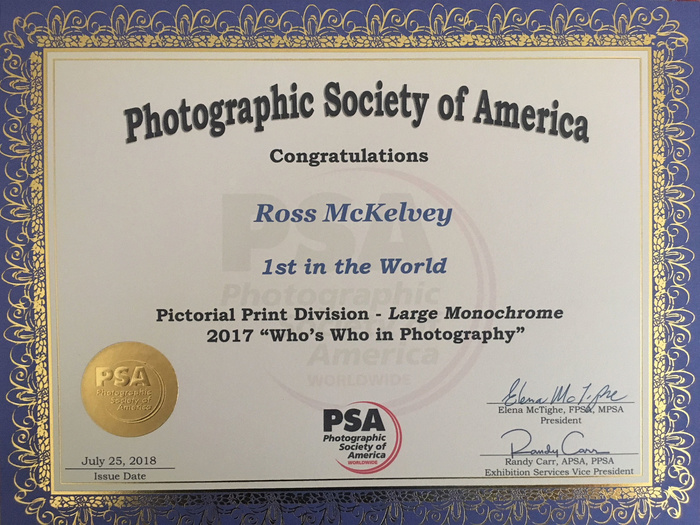 In 2018 I managed to become EFIAP/platinum - which is a first for any Northern Ireland photographer. The FIAP Distinctions are based upon success in International Exhibitions, with not only acceptances required, but also significant awards in several Countries. EFIAP/p used to be the Holy Grail, but FIAP has recently added new levels of Distinction called EFIAP/Diamond, but I have no intention of going down that route. However I was delighted to learn that during the process of entering all these exhibitions and sending prints off to exhibitions all around the World, I have been named the No.1 exhibitor in the World 2017 for monochrome prints by the Photographic Society of America, in its latest "Who's Who" in photography Ratings!